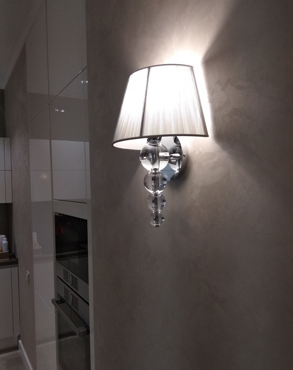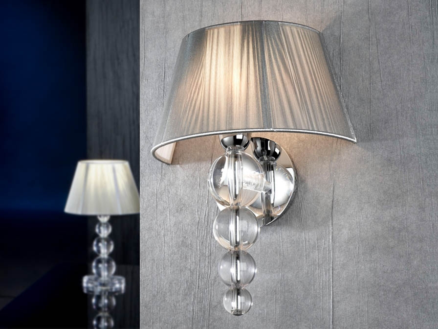 Стильное настенное бра Mercury фабрики Schuller с ножкой из эффектных прозрачных шаров разного диаметра из метакрилата. Абажур конусообразный двухслойный: внешняя часть оформлена серебряными нитями люрекса, внутренняя - белым плотным подкладом. Современная и популярная модель дизайнерского светильника с хромированным основанием и оригинальным абажуром неизменно украшает разные по стилю интерьеры спален, гостиных и прихожих, в которых устанавливается. Вы можете купить любую модель из коллекции светильников Mercury , в которую входят торшер, настольные лампы, люстры двух видов и разных цветов, у официального представителя бренда Schuller в нашем интернет- магазине schuller.style . В комплект к бра легко подобрать красивое современное зеркало из каталога выпускаемого фабрикой ассортимента.