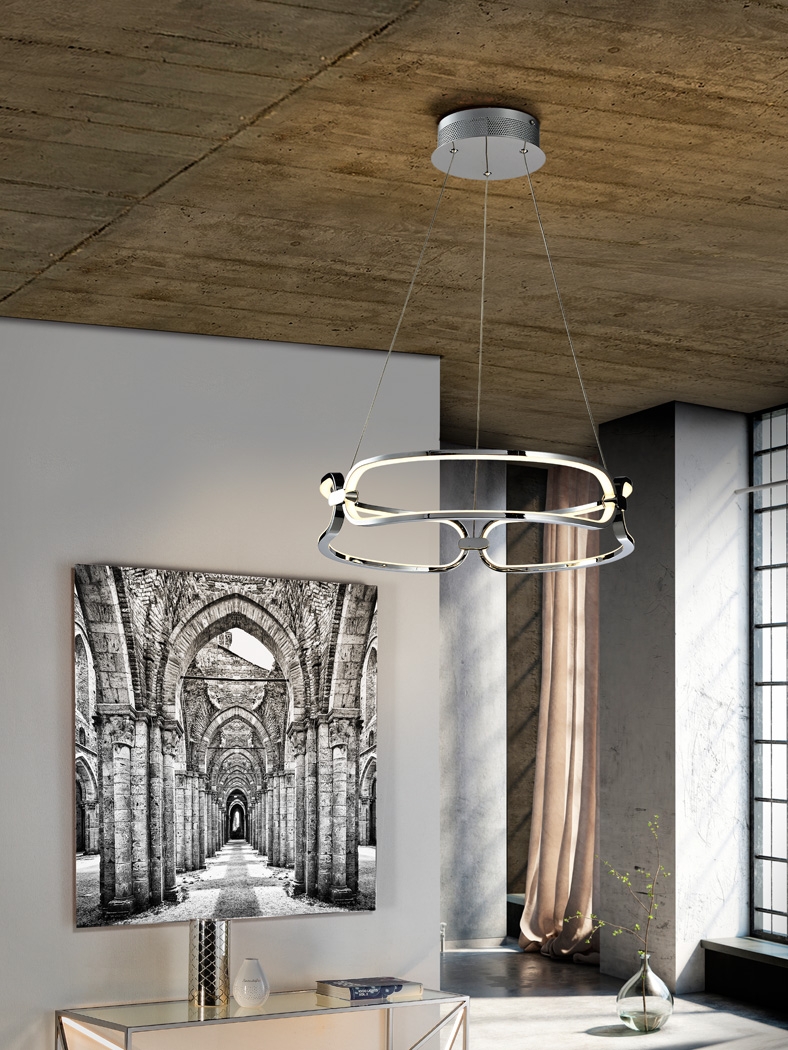 Подвесной светодиодный светильник из коллекции Collette с каркасом из алюминия с глянцевым покрытием "хром". По периметру декоративных колец с внутренней стороны расположены силиконовые рассеиватели опалового цвета. Высота регулируется по необходимости до 120 см. Артикул 786645 диаметром 47 см. Если нужен больший, то можно купить артикул 786831 60 см либо ещё больший 786973 80 см. Красиво выглядит в интерьере сочетание потолочной модели и подвесной. Фотопостер на стекле в интерьере с люстрой также доступен к заказу. Купить светильники фабрики Schuller из коллекции Collette просто- сделав заказ в нашем интернет-магазине либо отправив запрос на почту, а также позвонив по телефону в Москве. 37W LED, 3330 Lm, 3000 K. Средний срок работы светодиодов 50000 часов.