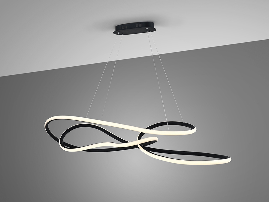Эффектный большой подвесной светильник- абстракция Evania арт.227643. Чёрная алюминиевая лента матового цвета общей длиной 120 см с силиконовым рассеивателем опалового цвета. Новинка февраля 2025 года фабрики Schuller доступна к покупке и поставляется с пультом управления с возможностью регулировки цветовой температуры от 2700 К до 5000 K и яркости освещения. 85W LED, 5.100 lm.
