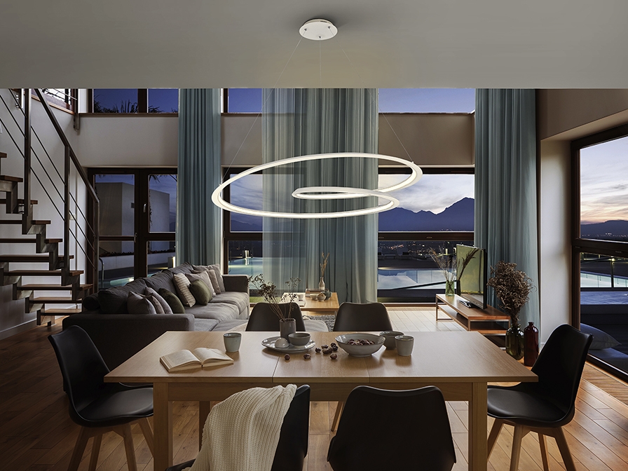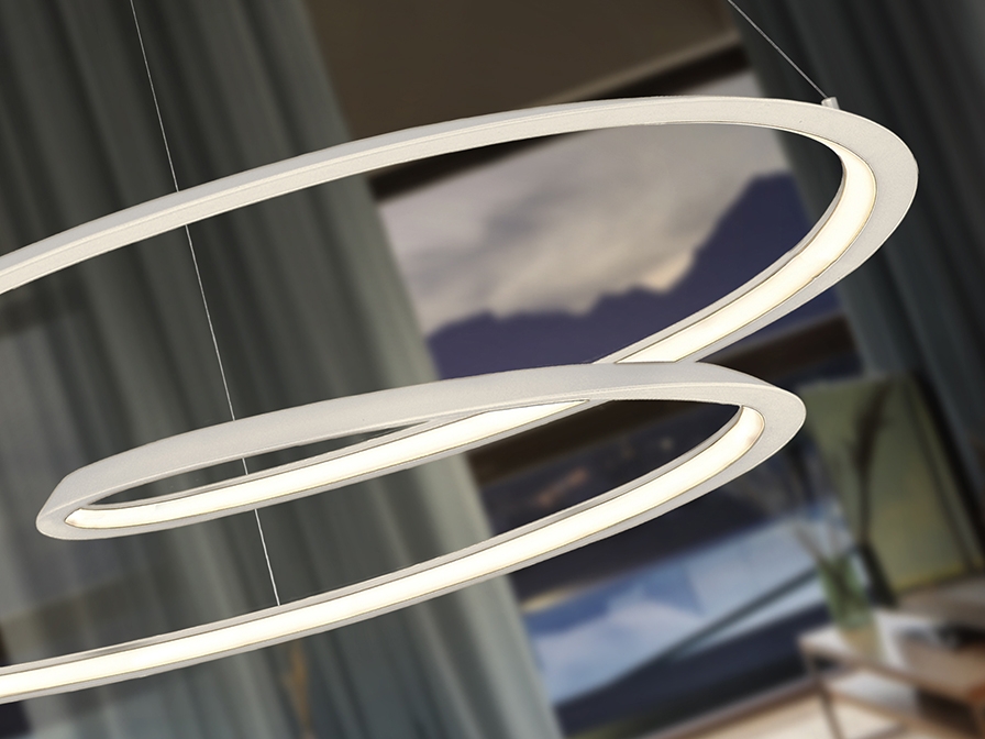 Современный светодиодный светильник Looping арт. 527637 сделан в виде большого белого завитка спирали. Диаметр его 97 см. Сплав с аллюминием даёт облегчённый вес- 3,8 кг вместе с потолочной чашей. Матовое покрытие не отвлекает внимание на блики, стильно смотрится в интерьере. Силиконовый рассеиватель молочного цвета расположен с внутренней части абажура.