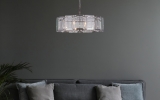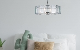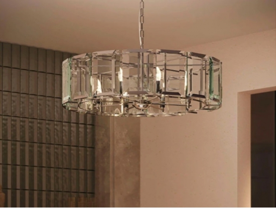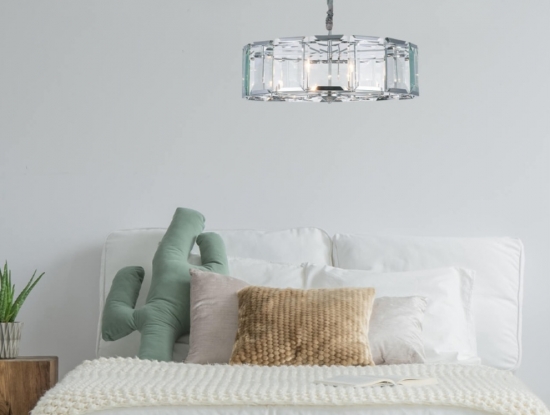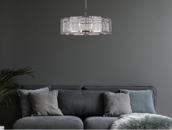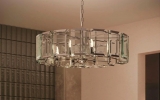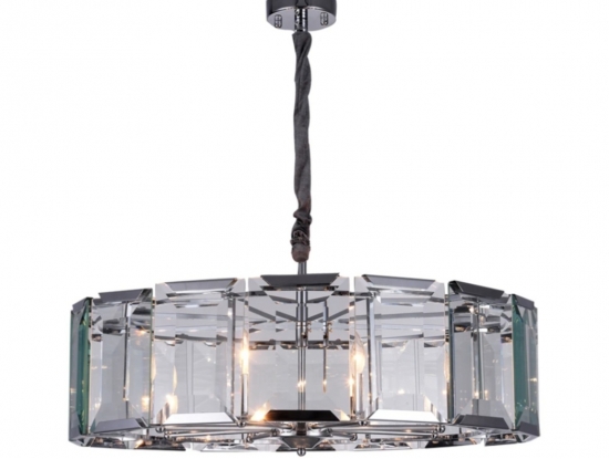 Современная широкая круглая люстра со стеклянными эффектными пластинами с огранкой у плафона высотой 25 см. Отделка металлического каркаса хромированная. Диаметр светильника 78 см. Длина цепи 45 см. Максимальная допустимая мощность лампочек 60 Вт* 8 шт, патрон E14. Площадь освещения 21 м2. Вес 18,43 кг. Крепление на планку.