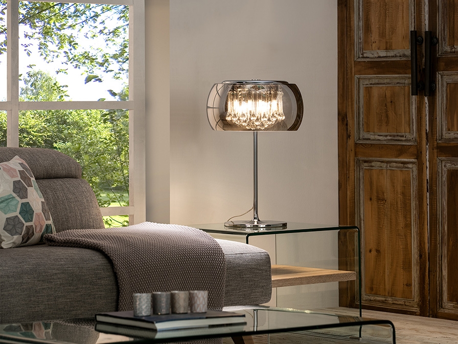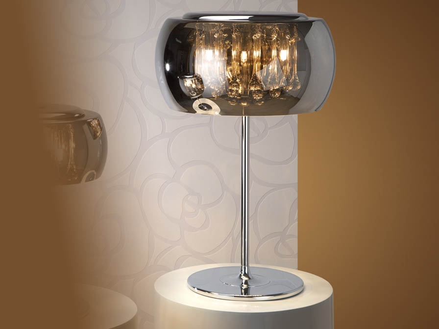 Современная высокая настольная лампа Argos с круглым зеркальным плафоном из стекла и красивыми прозрачными каплевидными подвесками внутри него. Лампочки с цоколем G9 LED 6W теплого света 3000К входят в комплект.