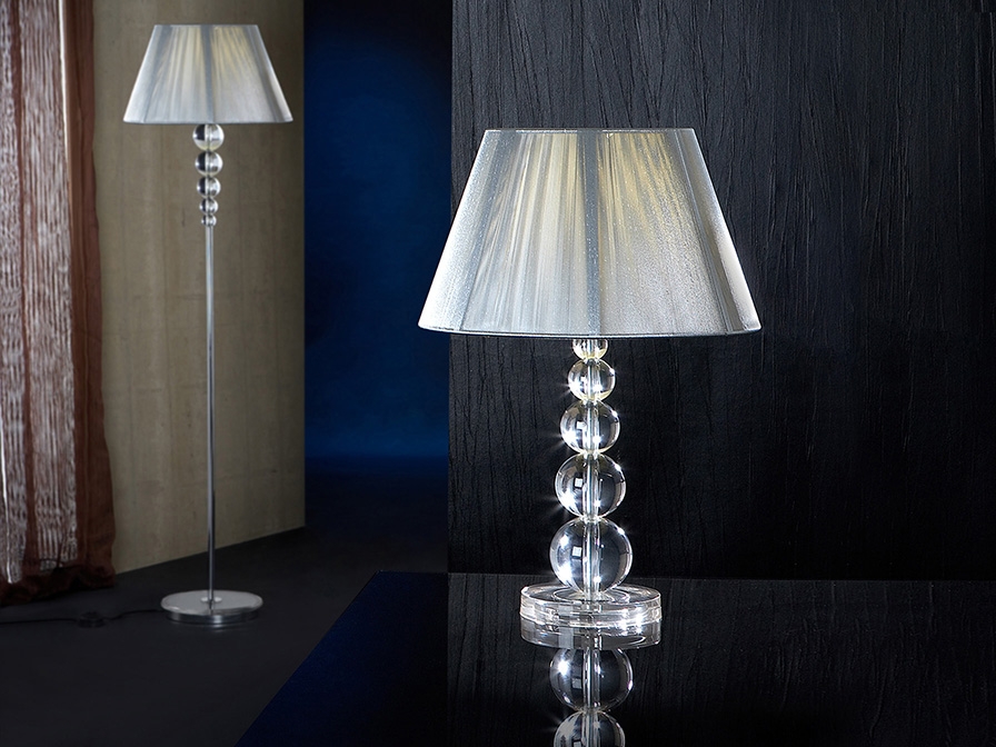 Большая настольная лампа из коллекции Mercury фабрики Schuller c ножкой, образованной шарами разного диаметра из прозрачного акрила и абажуром из серебристого люрекса на плотном каркасе. Лампочка 1шт E27 LED 10W входит в комплект. Прекрасный вариант для оформления интерьера современной спальни.