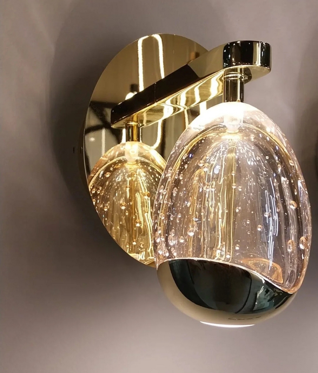 Настенное эффектное бра из коллекции Rocio Schuller в виде большой капли из массивного стекла в цвете "шампань" с пузырьками внутри. Плафон обрамляет золотистое металлическое основание. Свет при включении светит и вверх сквозь пузырьки, и вниз. У фабрики в этой серии есть и одиночные подвесы, и более объёмные светильники каскады в двух цветовых вариантах отделки. Данные светодиодного освещения: 5W LED, 480 lm, теплый свет 3,000 K. Средний срок службы рассчитан на 50 000 часов.