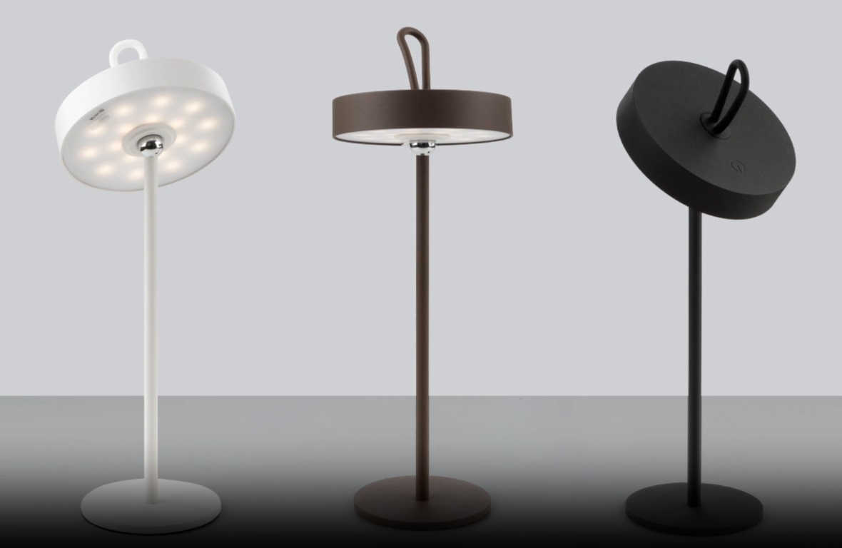 Необычная настольная светодиодная лампа Gong для интерьеров и улицы со съемным плафоном с силиконовой ручкой, за которую его можно переносить либо подвешивать где надо, используя в том числе и в качестве ночника. Крепится к ножке на магните. Яркость можно регулировать, тк эта модель диммируемая. Изготовлена из металла с белой отделкой и рассеивателя из акрила опалового цвета.