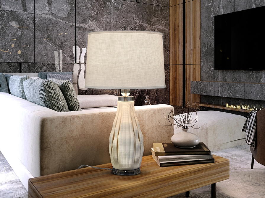 Высокая настольная лампа Tessa изготовлена по современным технологиям из 3D керамики белого цвета. Основание и декоративный шарик на ножке сделаны из прозрачного акрила. Металлические делали хромированные. Абажур из белой ткани. Mаксимальная мощность: 20 Вт led.