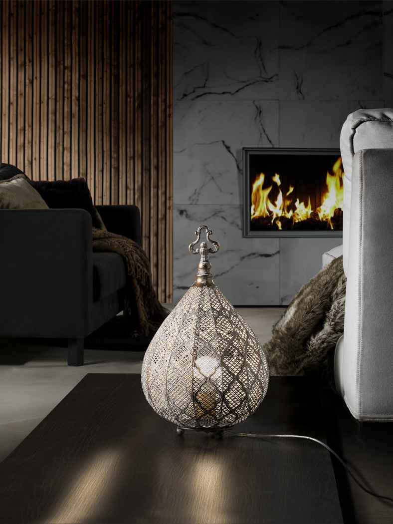 Интересная настольная лампа- фонарь с абажуром из резного чеканного металла. Покрытие золотое с белой патиной. Одна лампочка с цоколем Е27.