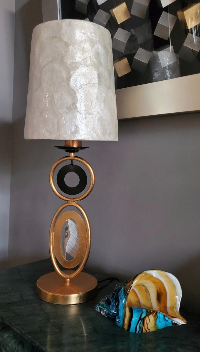 Высокая настольная лампа Eden высотой 65 см с отделкой металлической ножки сусальным золотом. Акцентом модели является центральный круг в черном лаке. Конический абажур украшен аппликацией из натуральных перламутровых пластин. Светильник интересно смотрится в классическом, неоклассическом интерьере либо этническом, добавляя ему нотку роскоши природных материалов.