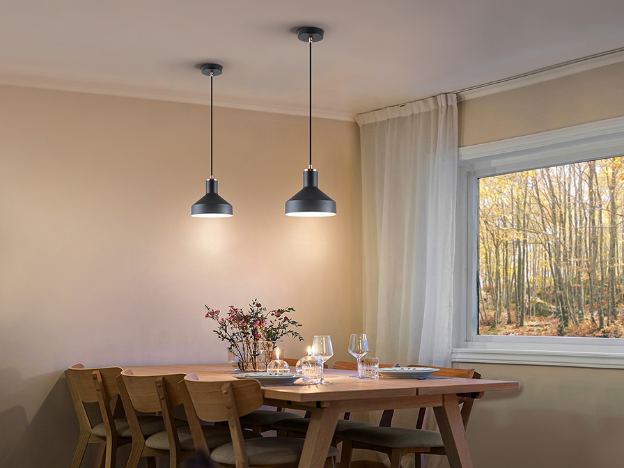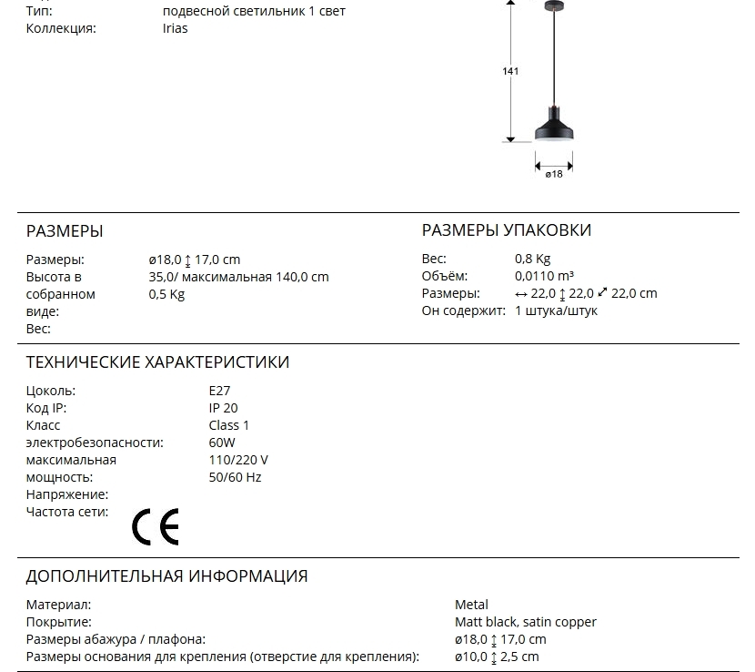 Подвесной светильник из новой коллекции Irias с одним широким плафоном диаметром 18 см изготовлен из металла, окрашенного в черный матовый цвет, с деталями из сатинированной меди. Регулируемая высота подвешивания. 1 лампочка с патроном E27 максимально допустимой мощности 20 Вт.