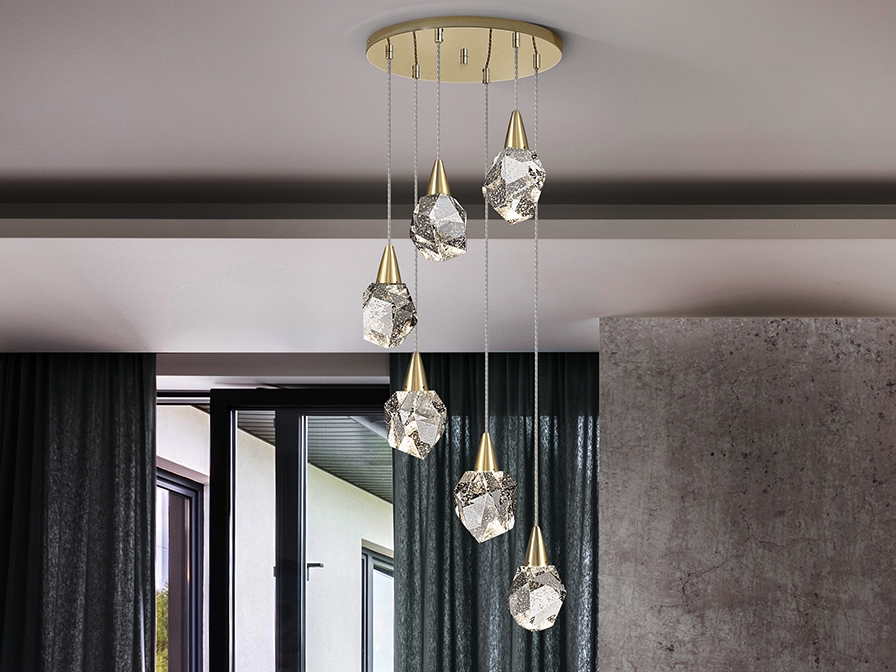 Люстра из новой коллекции Aquaria с шестью многогранными подвесами из цельного стекла с декоративными пузырьками внутри. Каркас светильника изготовлен из металла с отделкой "матовое золото". Регулируется по высоте каждый плафон отдельно. Светодиод: 24 Вт. 2700 Lm. теплый свет 3000 К.