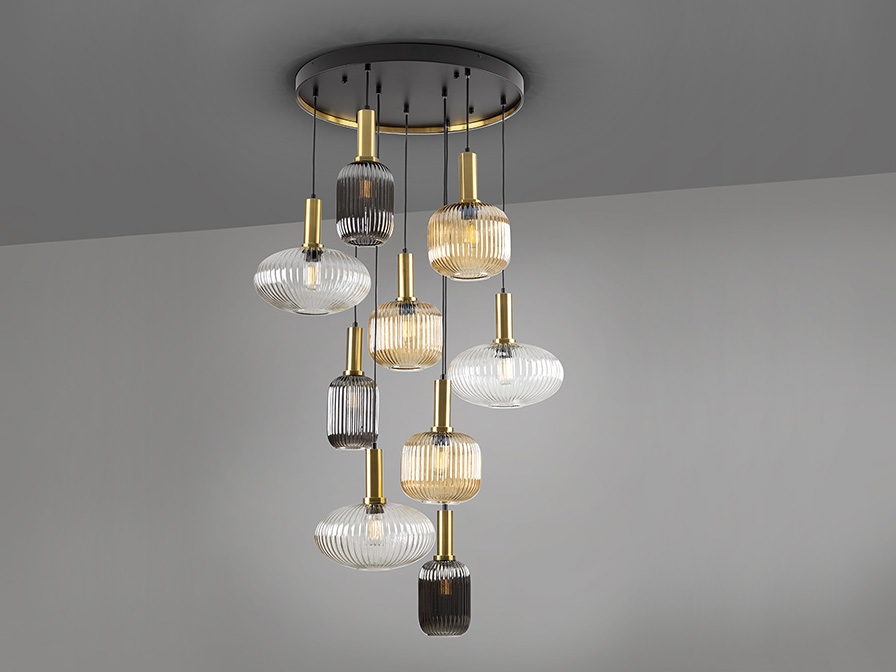 Современный трехцветный светильник- каскад Norma с девятью подвесами разной формы. Артикул 225090. Основание люстры изготовлено из металла в черной матовой отделке с контрастными деталями латунного цвета. Все плафоны из литого рифленого стекла: 3 прозрачных, 3 янтарных и 3 с зеркально- серым покрытием. Длина подвешивания каждого регулируется до 320 см.