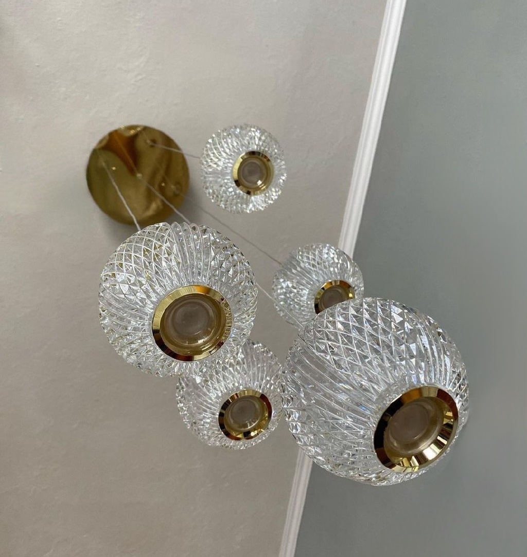 Подвесная люстра- каскад Austral представляет собой круглое золотое основание с пятью регулируемыми по высоте оригинальными круглыми резными шарами диаметром 11 см из прозрачного оптического акрила, подобного стеклу. В нижней части каждый подвес украшает глянцевое золотое кольцо . Мощность светодиодного светильника 26W LED, 1264 Lm, цветовая температура 3200K. Срок службы рассчитан примерно на 30000 часов. Красиво смотрится при оформлении современной кухни, спальни, а также придиванной зоны в интерьере гостиной.