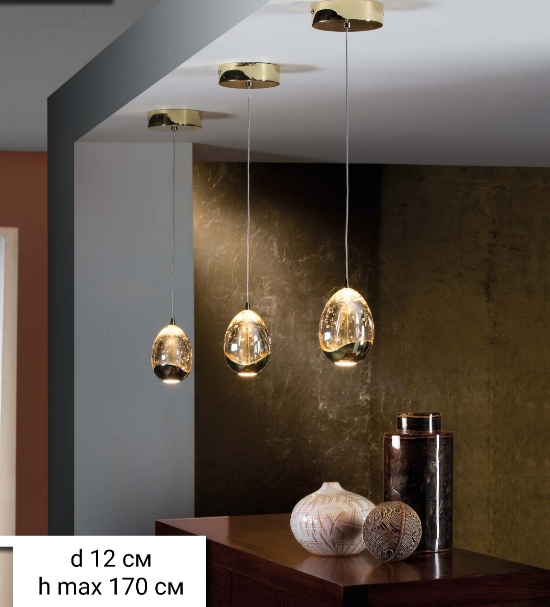Современный, потолочный подвес с прозрачным плафоном в виде изящной, золотой капли, наполненной многочисленными пузырьками воздуха. Основание выполнено в глянцевом золоте. Высота подвешивания светильника регулируется. Лампочки: 5W LED, 650 Lumen, 3.000K. Средний срок службы: 50.000 часов.