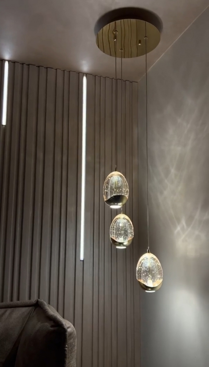 Оригинальный светодиодный светильник с тремя каплевидными прозрачными плафонами из стекла цвета "шампань", заполненными многочисленными пузырьками воздуха, отражающими попадающий на них свет. Отделка каркаса в цвете "золото". Высота каждого подвеса регулируется. Лампочки уже внутри каждой "капли": 15W LED, 1008 Lm, 3000.