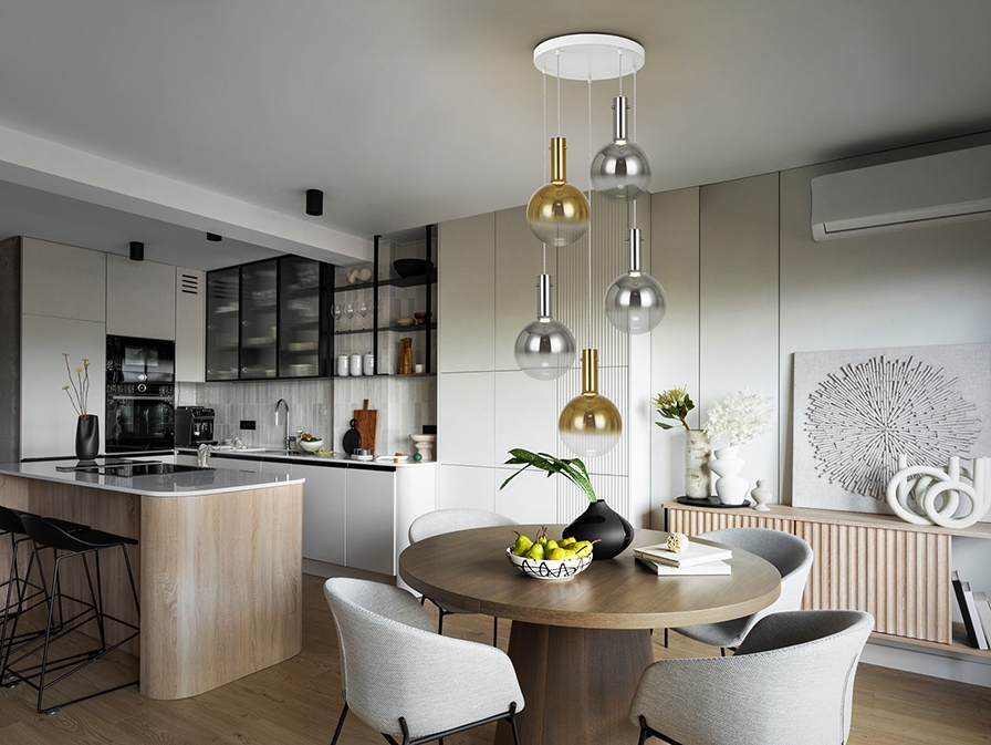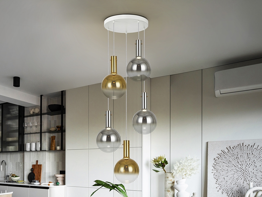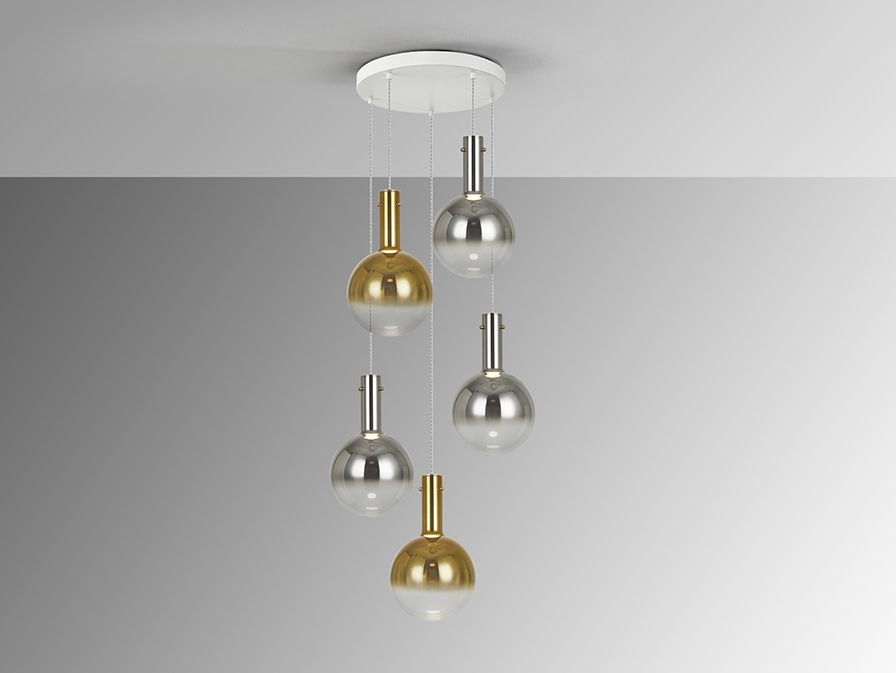 Современный светодиодный светильник Matices с оригинальными стеклянными плафонами на длинных ножках, как фонарики. Каркас изготовлен из металла матово-белого цвета. Всего 5 сменных плафонов из выдувного стекла ø20 см двух цветов: дымчато- зеркального и золотисто- зеркального, каждый регулируется по высоте. Световой поток: 30W LED, 2408 lm, 3000K.