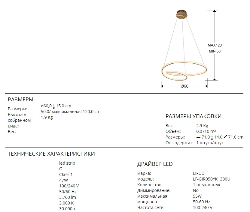 Характеристики светодиодного потока: 47W LED, 3760 Lm, теплый свет 3000K. Отличное решение для оформления интерьера современных комнат. Средний срок службы рассчитан на 30000 часов. Выгодно купить люстру Schuller с быстрой поставкой удобно в нашем интернет-магазине, не выходя из дома, отправив заказ в любое время.