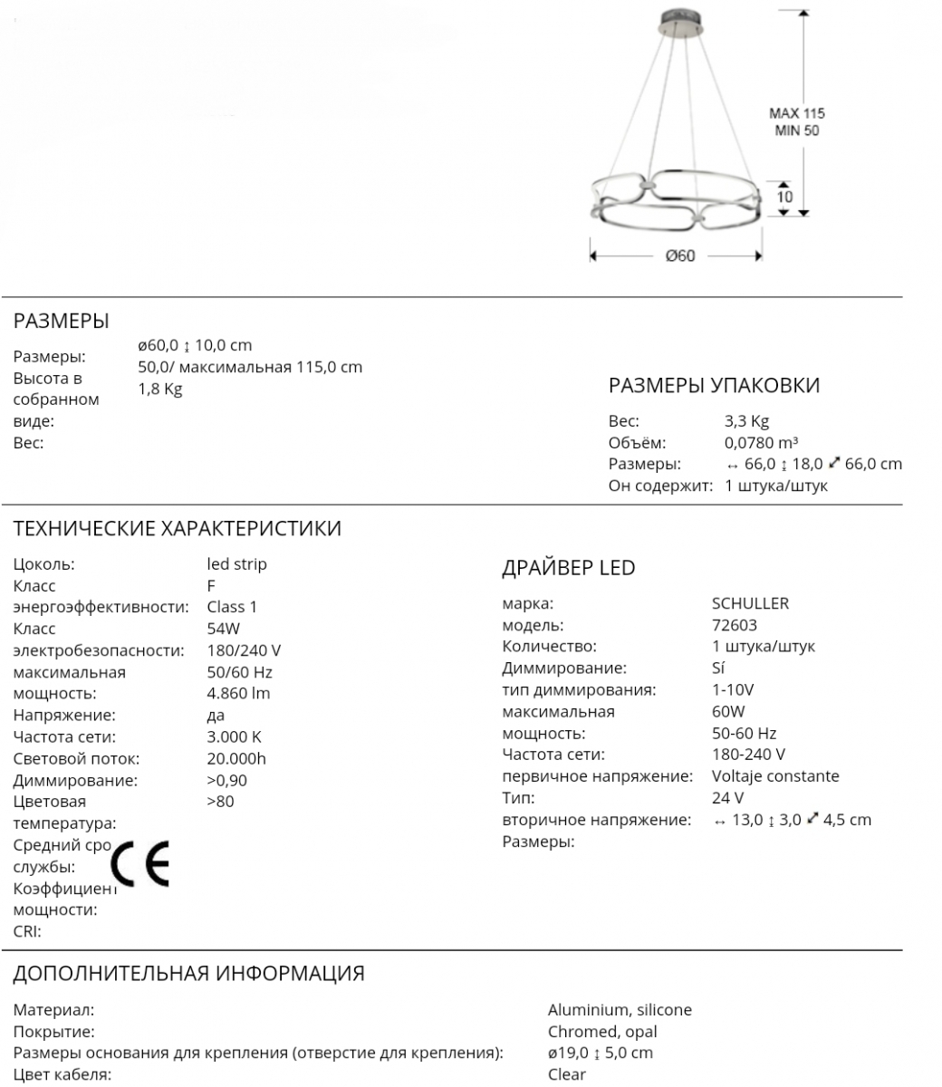 Подвесной стильный led светильник из эффектной коллекции Colette с изящными формами плафона от фабрики Schuller. Алюминиевый каркас в цвете "глянцевый хром" с силиконовым диффузором опалового цвета по периметру люстры. 54W LED, 4860 lm, 3000 K. Прекрасный вариант для оформления обеденной зоны в современном интерьере. Фабрика предлагает два варианта отделки в коллекции Colette: золото и хром. Купить светильник- новинку Schuller нужного цвета легко в нашем интернет-магазине, оформив заказ либо позвонив по телефону в Москве.