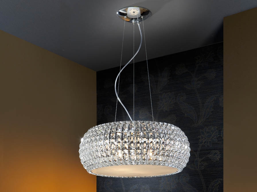 Стильный светильник с одним круглым плафоном из стеклянных кристаллов с огранкой. Нижний рассеиватель опалового цвета мягко пропускает свет. Высота подвешивания регулируется по необходимости. Максимальная высота 125 см, Лампочки: 9шт G9 макс. 40w.
