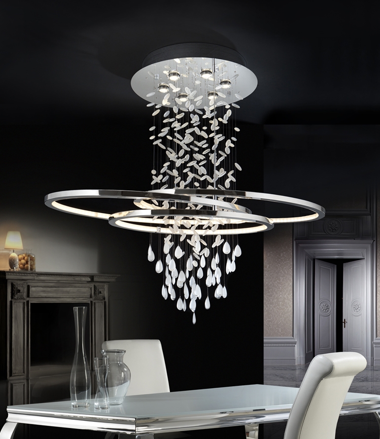 Стильная эффектная большая люстра из коллекции Bruma в актуальном для современных интерьеров стиле украсит залы гостиных либо просторных холлов. Многочисленные, каплевидные подвесы выполнены из белого стекла с прозрачной окантовкой. Отделка металла в цвете "хром". На декоративных овальный кольцах расположены рассеиватели из белого метакрилата с внутренней светодиодной лентой 82W. Крепление на потолок. Лампочки: 6 шт с цоколем GU10 LED 3W входят в комплект и крепятся на основании светильника.