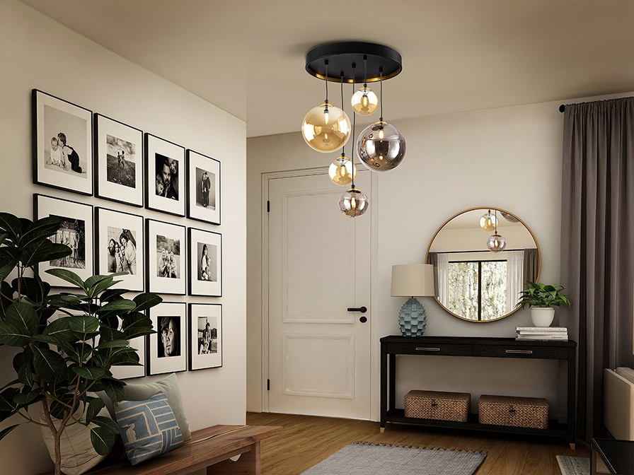 Круглый потолочный светильник 45 см из коллекции Dark фабрики Schuller с прозрачными плафонами- эффектными шарами из стекла дымчатого и янтарного цвета диаметром 12 и 20 см и регулируемой высотой подвешивания. Цветовую гамму дополняет чёрное металлическое основание с декором на внутренней части в цвете латуни. Современная модель для разных интерьерных пространств. 5 лампочек с цоколем G9 LED 4W в комплекте. Максимально допустимая мощность: 5x28W.