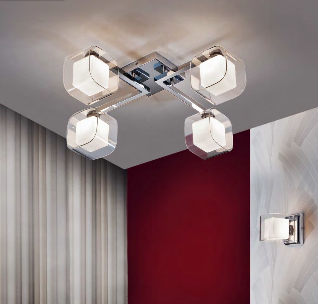 Простая геометрия прямых линий- потолочный светильник с одноимённым названием Cube с 4 плафонами и основанием из стали с покрытием "хром". Особенность коллекции- двойные плафоны из штампованного стекла: внешние плафоны прозрачные, внутренние кубики из стекла опалового цвета.