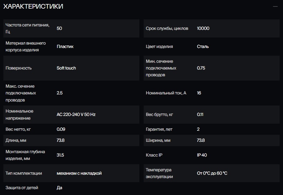 Внешние накладки и корпус выполнены из поликарбоната- долговечного и безопасного материала. Он не разлагается под действием ультрафиолета и выдерживает повышенные температуры, вызванные протекающими токами. Контактные пары выполнены из бронзы, заземляющие контакты- с дополнительным гальваническим покрытием. Бронза обеспечивает высокую безопасность при подключении электроприборов и эффективную бесперебойную передачу тока, сохраняя передаточное усилие, что повышает срок безотказной эксплуатации. Срок службы: 10000 циклов.