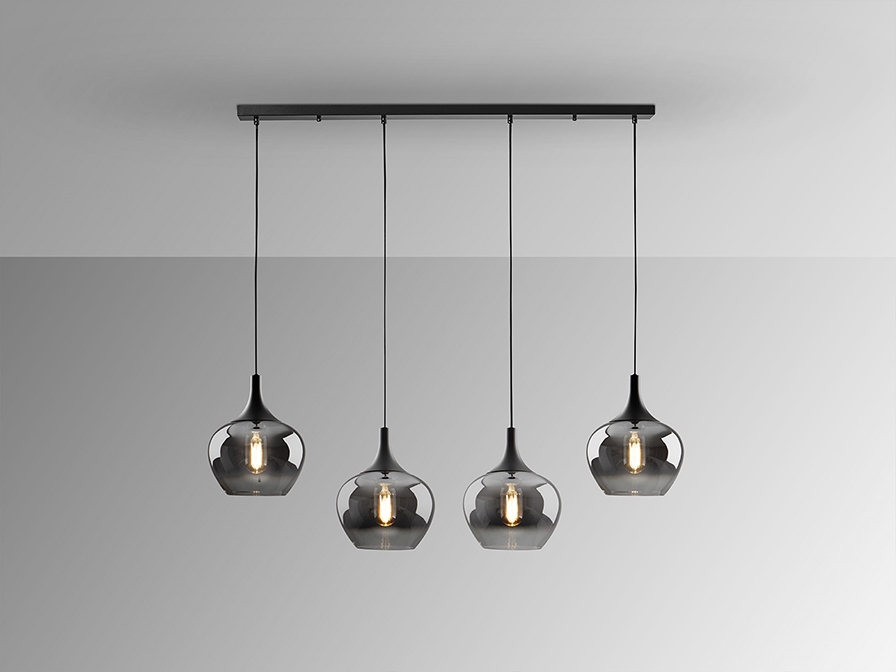 Подвесной светильник Opaz арт. 614245 с четырьмя большими каплевидными плафонами из зеркально- дымчатого стекла. Потолочное основание- прямоугольная планка с отделкой матового черного цвета. Высоту подвешивания каждого подвеса диаметром 19 см можно по желанию регулировать. Лампочки: 4 шт E27 LED max 20W.