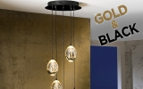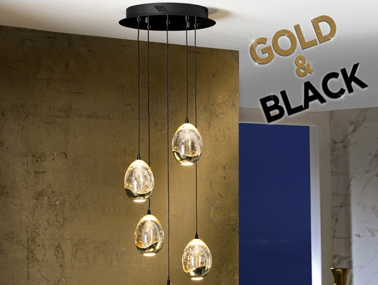 Современный светодиодный светильник Rocio с новой отделкой и интересными плафонами - каплями из массивного прозрачного стекла с оттенком шампанского и с пузырьками внутри. Золотой глянец сочетается с чёрной матовой отделкой основания и кабеля. Высота каждого из пяти подвесов регулируется при необходимости. Можно сформировать новую композицию. Потолочная чаша диаметром 30 см. Свечение направлено и вверх, и вниз. Данные светового потока: 25W LED, 2400 Lm, теплый свет 3000 К.