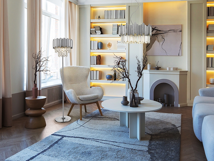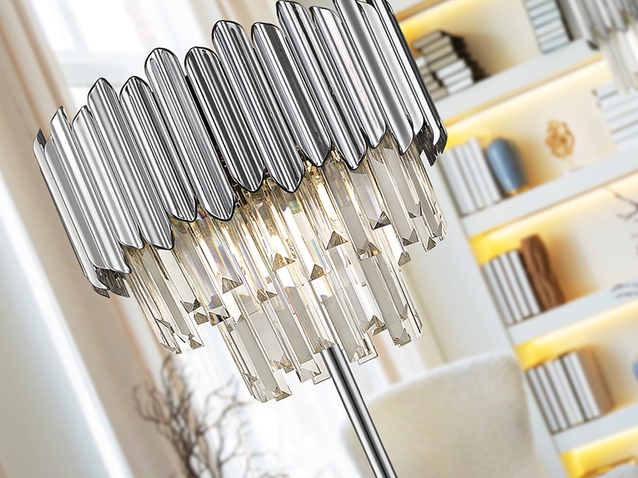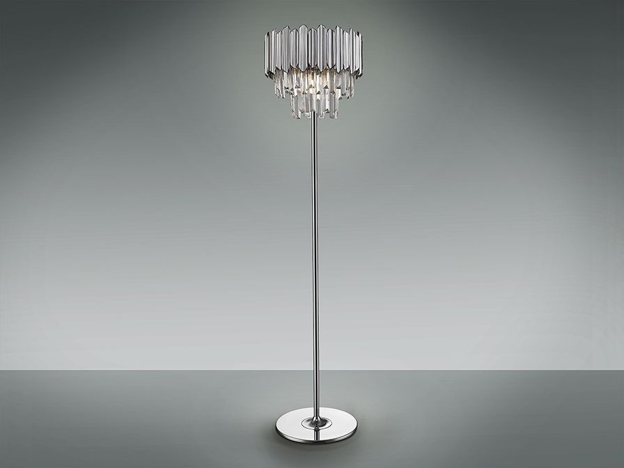 Современная модель- торшер Tiara 605014 с абажуром, образованным многочисленными подвесками- призмами из прозрачного стекла в обрамлении хромированных элементов из ABS пластика. Ножка металлическая с круглым основанием. 3 лампочки входят в комплект. Цоколь G9, led 6W. Максимально допустимая мощность светильника: 3х 28W led.