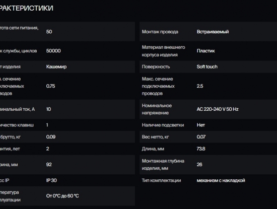 Традиционный для множества помещений одноклавишный выключатель серии Voltum S70. Его высота и ширина- 71 мм. Изготовлен из негорючего и устойчивого к ультрафиолету поликарбоната с поверхностью Soft touch. Диагональные отверстия суппорта предназначены для удобного крепления механизмов в нестандартных условиях, не требующих применения подрозетников. Механизм самозажима в выключателях надежно соединяет провод с клеммой без помощи специальных инструментов, благодаря чему монтаж не занимает много времени. Срок службы: 50000 циклов.