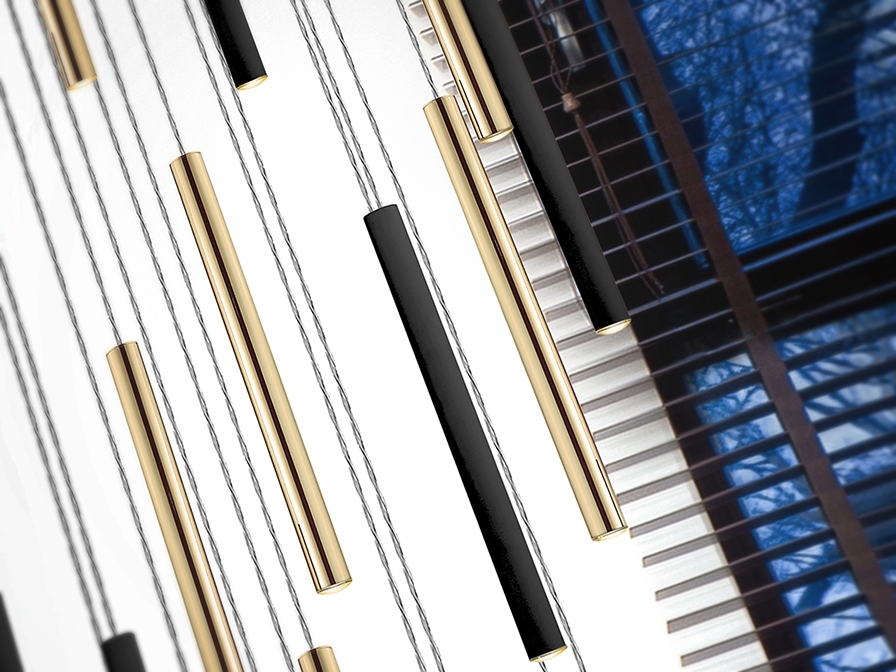 Большая светодиодная люстра Varas образована из 25 подвесов трубок диаметром 3 см каждая. Основание диаметром 90 см черное матовое. Подвесы двух цветов: глянцевое золото и черный матовый. Каждый подвес можно отрегулировать по высоте при необходимости. Максимальная высота светильника- 300 см. Эффектная модель для загородных домов и двухъярусных квартир. 125W LED, 11250 lm, теплый свет 3000 K. Средний срок службы рассчитан на 50 000 часов. Кабель на трубках использован прозрачный.