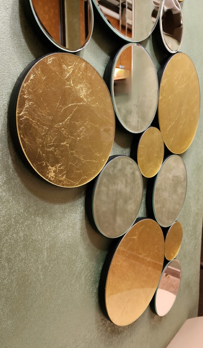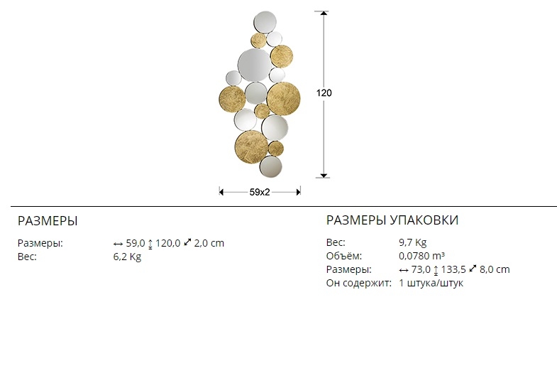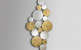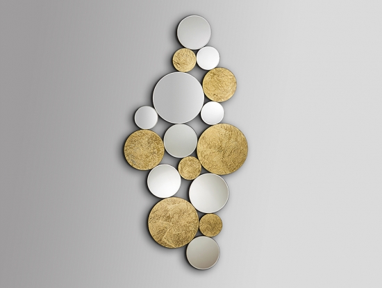 Эффектно и необычно: зеркальный настенный декор Cirze от испанской фабрики Schuller представляет комбинацию многочисленных зеркальных кругов разного диаметра с фацетом и кругов из прозрачного стекла, под которыми находится золотая фольга, которая придает пространству стильный и элегантный вид. Рисунок фольги в разных кругах всегда отличается, она наносится мастерами вручную. Все элементы зеркала расположены в одной плоскости и закреплены на одной основе из мдф черного цвета- дополнительеая сборка не требуется. Это дизайнерское зеркальное панно легко купить в Москве в нашем интернет- магазине в любое удобное время, не выходя из дома. Фабричное крепление предусмотрено в вертикальном и горизонтальном положении- на выбор. Универсальный декор стен, так как подходит для оформления гостиной, прихожей, спальни и даже кухни, оформленных в различных стилях, казалось бы, совсем разных: от минимализма до ар-деко. Если нужен бОльший размер, то можно выбрать объемное прямоугольное панно из той же коллекции Cirze.