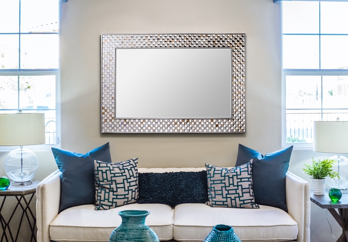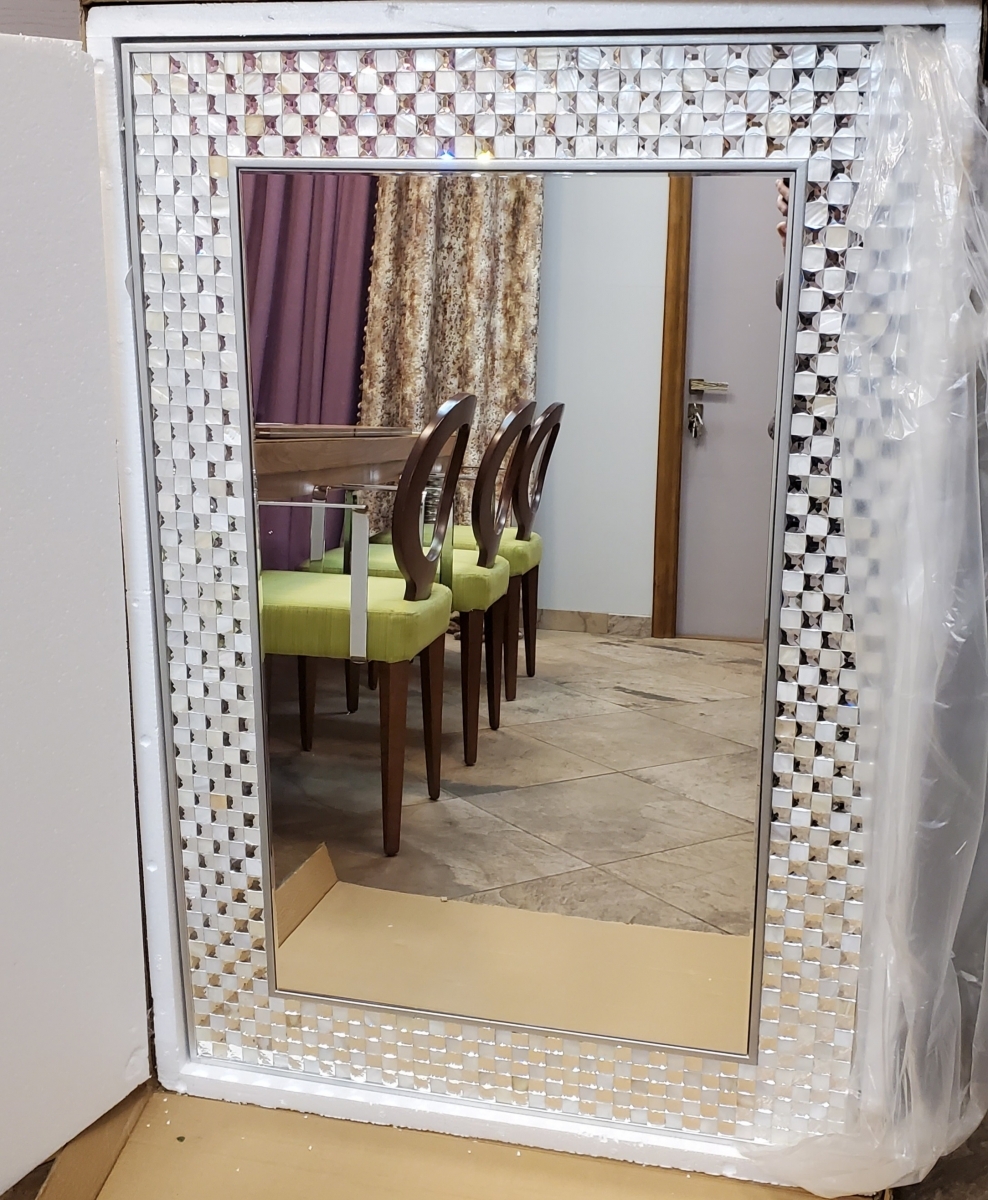 Прямоугольное дизайнерское зеркало Chiara фабрики Schuller. Эффектная рама собрана из небольших квадратиков перламутра и зеркального стекла с огранкой в двойном обрамлении узкой серебристой окантовки. Центральное зеркало по периметру украшает декоративный фацет. Основание из МДФ серебряного цвета подготовлено для навески в горизонтальном либо вертикальном положении. Купить зеркала фабрики Schuller с быстрой доставкой по Москве либо отправкой в Санкт-Петербург и другие города России можно в нашем интернет-магазине. Возникают вопросы? Пишите либо звоните, будем рады помочь с подбором зеркал и светильников.