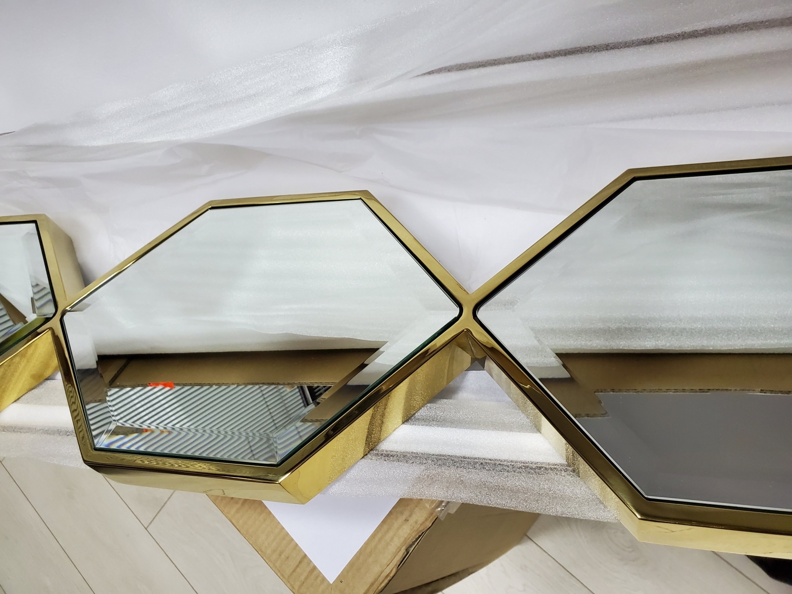 Красивое зеркальное панно Sarrono арт.111075 от голландского бренда Eichholtz. Зеркальные шестигранники в обрамлении глянцевого золота. Рама массивная металлическая высотой 110 см. По периметру каждого ромба сделан красивый широкий фацет. При оформлении современного интерьера эти зеркала наиболее эффектно смотрятся при парном сочетании. Купить зеркало Eichholtz в Москве с быстрой доставкой легко в нашем интернет-магазине, сделав заказ на сайте, по телефону либо электронной почте.