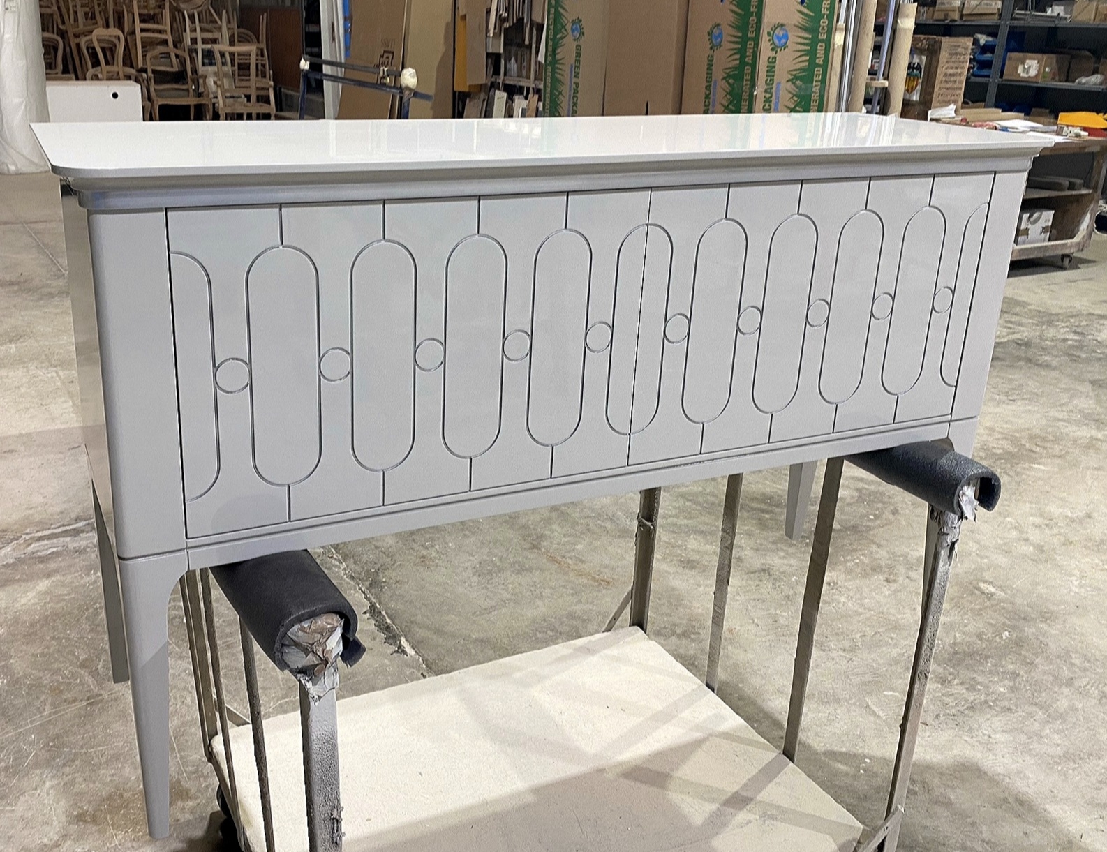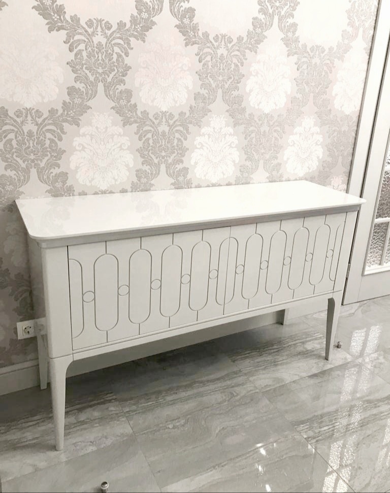Современная модель: небольшой белый комод на высоких ножках всего 141,6 см длиной с оригинальной гравировкой на фасадах дверей стильно украшен аккуратной серебряной отделкой. В данном исполнении в качестве основного был выбран белый цвет с легким серым оттенком под уже существующий интерьер. На заказ покраска может быть другая с другими цветовыми акцентами. Длина комода также может быть 201,9 см либо 181,5 см.