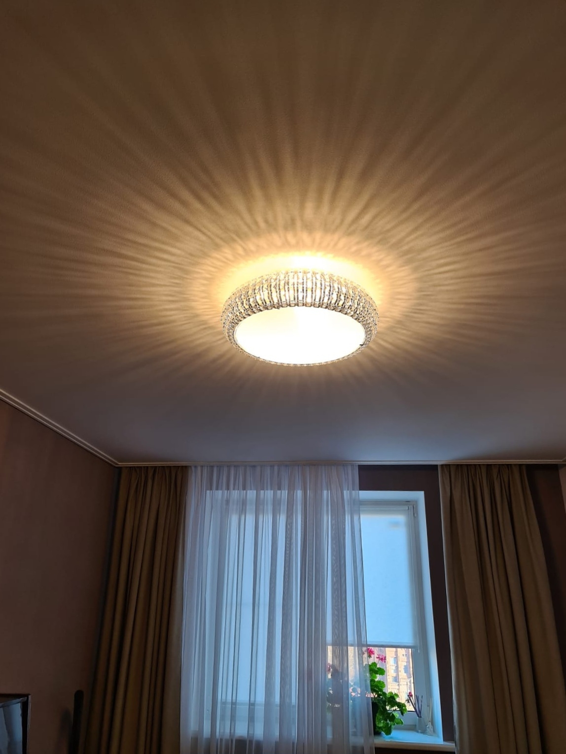 Большой потолочный светильник из коллекции Diamond с многочисленными прозрачными кристаллами на плафоне в интерьере спальни. Лампочки 6W теплого света с цоколем G9 поставлены из комплекта, при желании их можно заменить на более яркие по мощности.